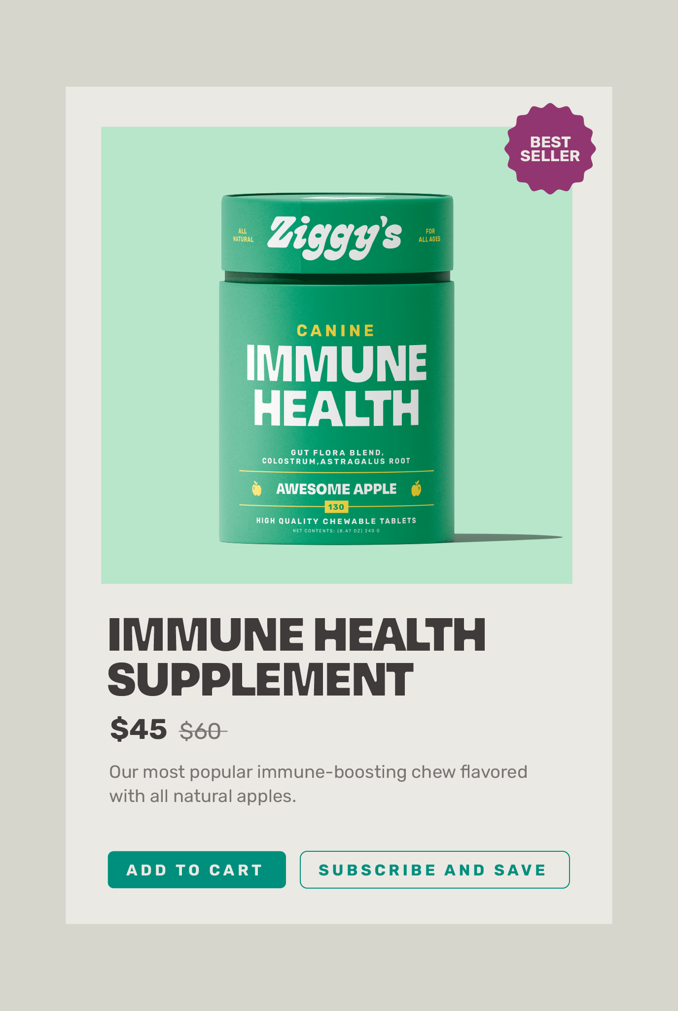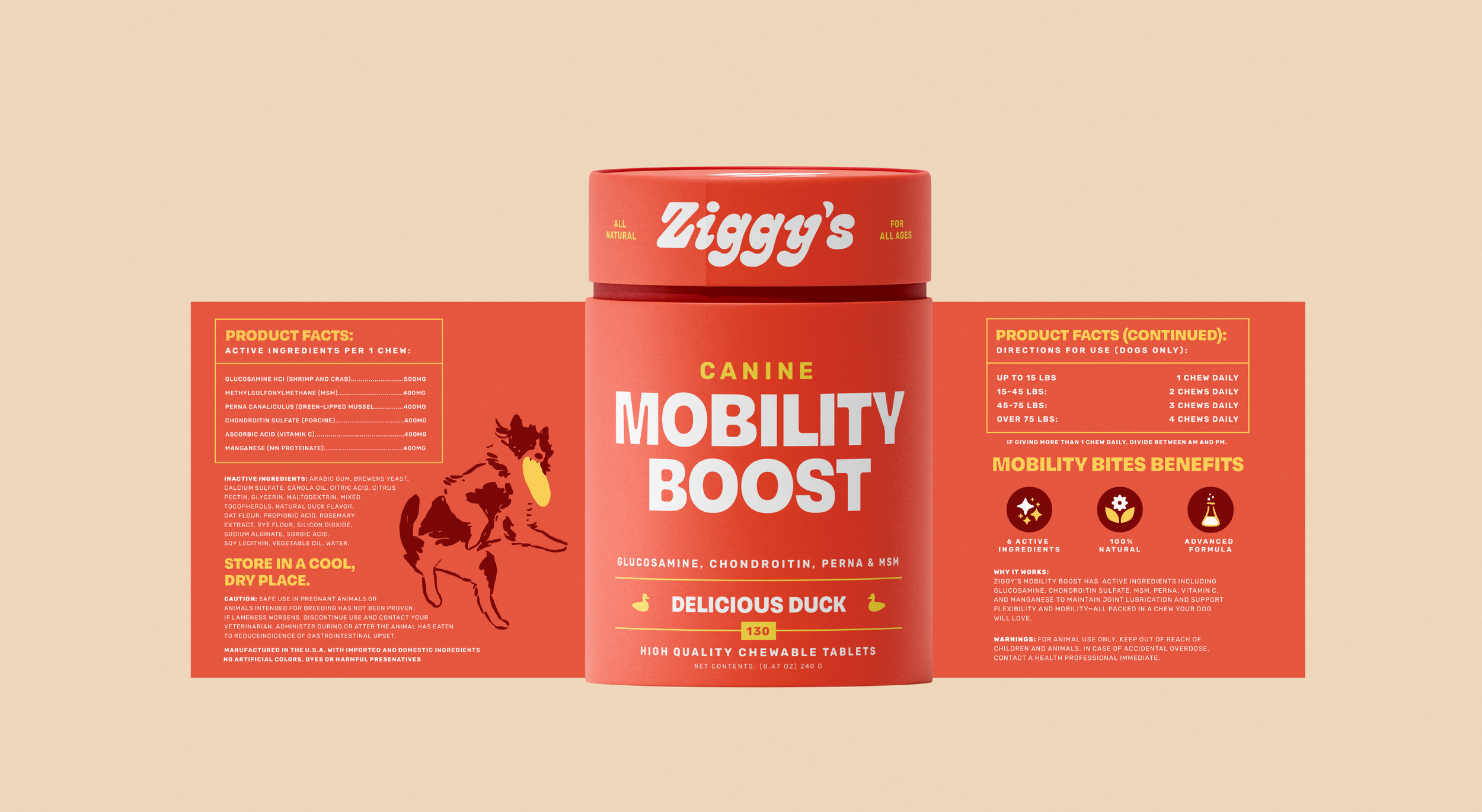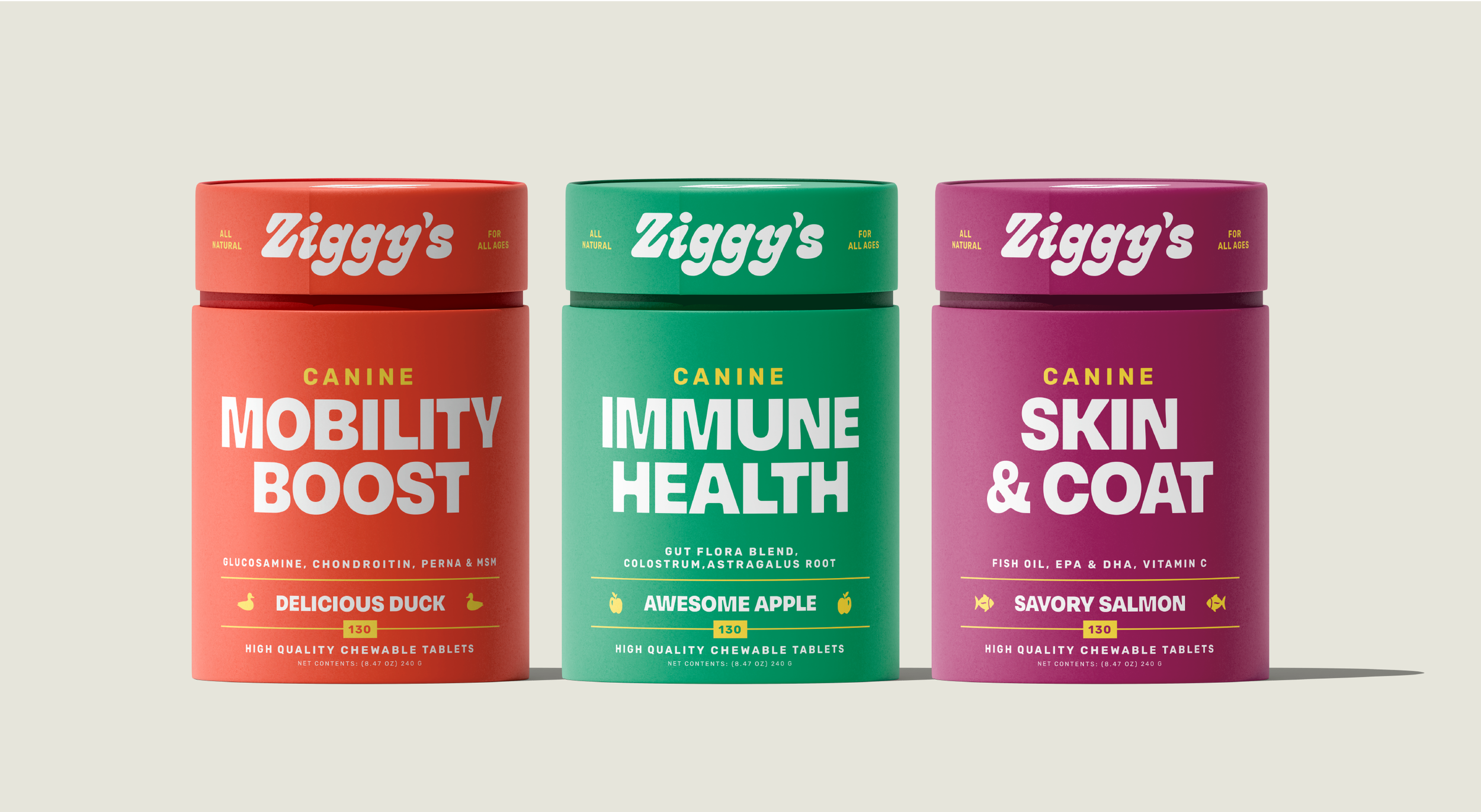 The Ziggy’s brand and containers utilize an extended color palette so the packaging can flex as the brand grows. The supplement containers should be something that dog owners and their pups are excited to interact with. This meant creating a package that is aesthetically pleasing while being able to balance the technical information required.